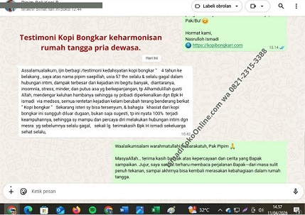 Kisah Sukses: Bpk. Pipim Saepillah (57 Tahun) “Selama 4 tahun terakhir, saya mengalami penurunan vitalitas yang sangat berdampak pada psikologis saya—mulai dari stres, insomnia, hingga hilangnya rasa percaya diri. Namun, setelah saya berkonsultasi secara holistik dengan Bpk. H. Nasrulloh Ismadi dan rutin mengonsumsi Kopi Bongkar, perubahannya sangat luar biasa. Stamina dan kepercayaan diri saya kembali pulih, dan keharmonisan rumah tangga kami kembali hangat. Kopi Bongkar bukan sekadar sugesti, ini adalah ikhtiar nyata yang sangat saya syukuri. Terima kasih Pak Ismadi, sehat selalu!”
